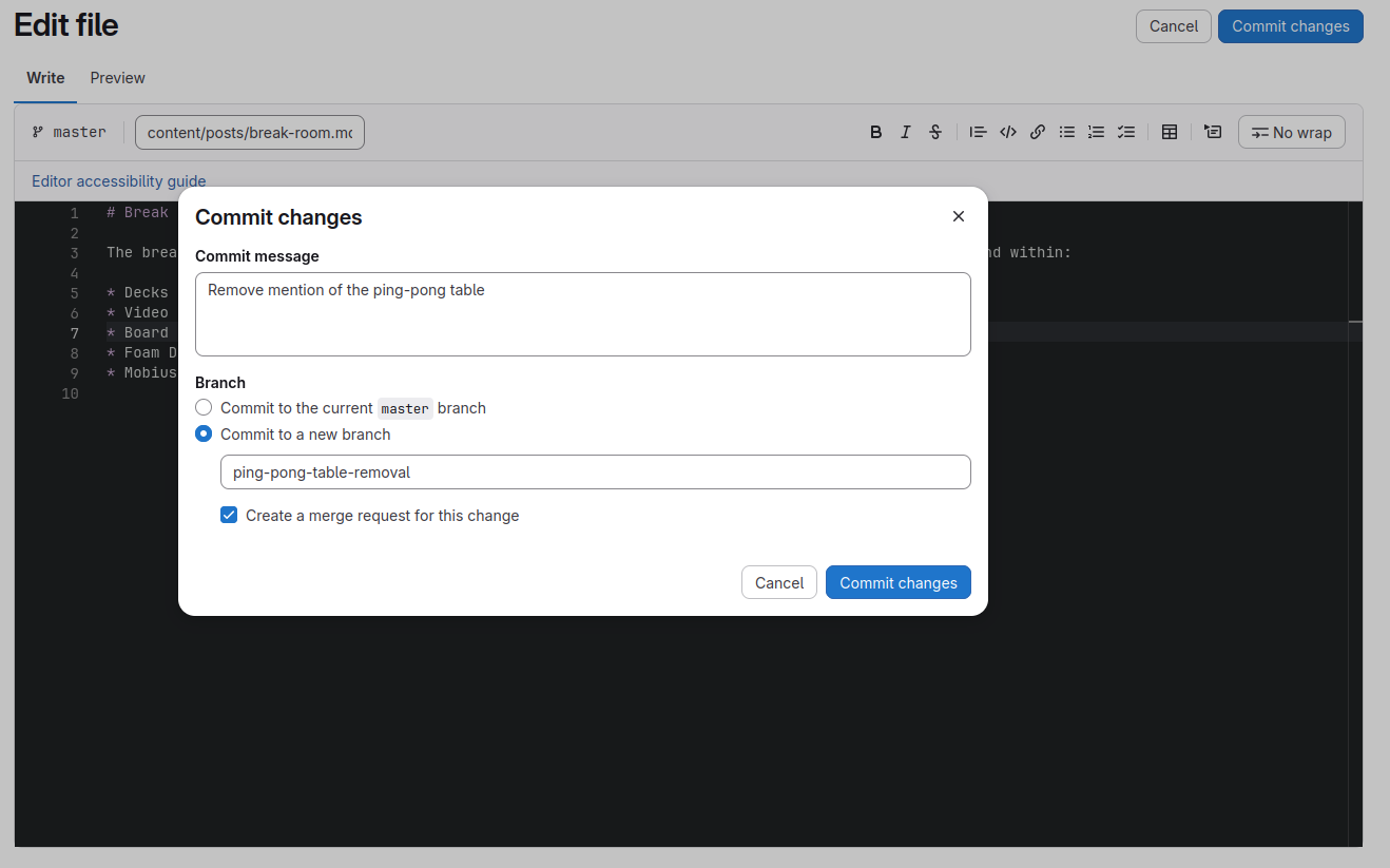 It is possible to commit (save) your changes directly to the file. However, this is not recommended for most teams, as it is good practice to first have your changes reviewed by a team member. In this step, you'll create a branch and merge request with the new changes.