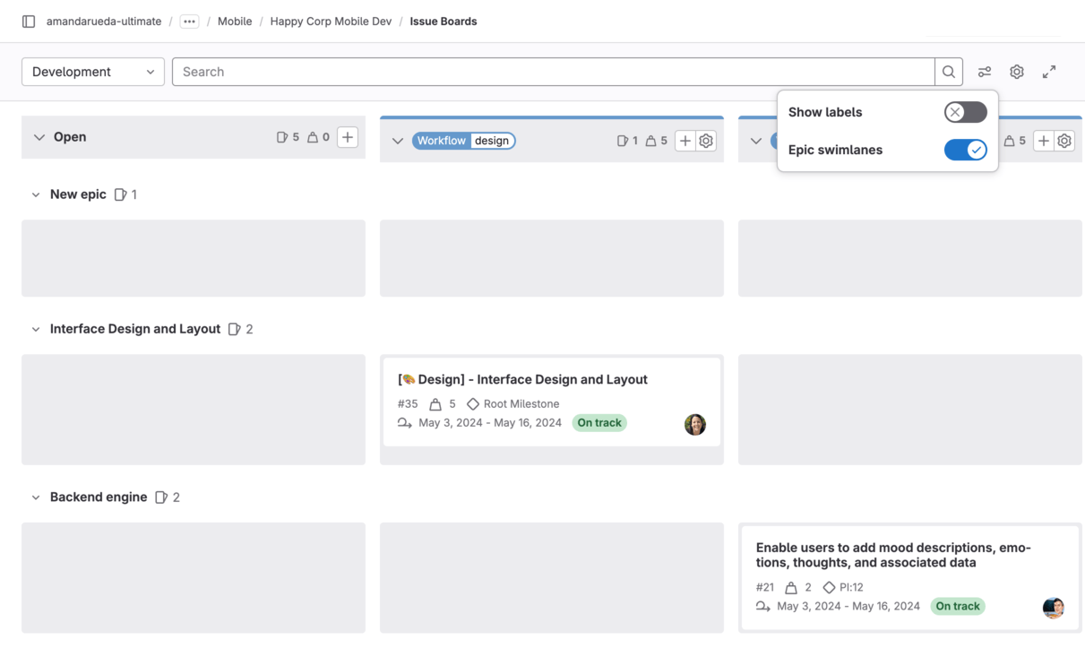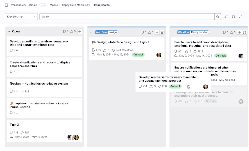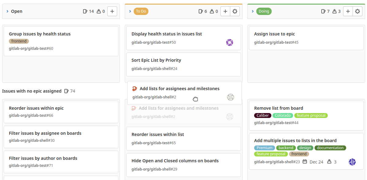 Your issues appear as cards in vertical lists, organized by their assigned labels, milestones, iterations, assignees or status.